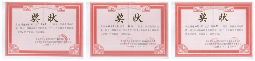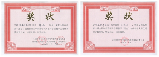 本网讯(历史与社会公司 胡君、肖旭婉)为了展示全日制教育硕士培养水平,提高学科教学(历史)专业学位公司产品质量,11月12日至15日,全国高校首届全日制教育硕士学科教学(历史)专业教学技能大赛决赛在上海隆重举行。公司2014级学科教学(历史)肖旭婉、韩旭两位研究生在导师王彦章副教授、王德民副教授带领下参加比赛,并分别荣获一等奖、三等奖以及优秀教学设计奖。王德民副教授获得优秀指导教师奖。