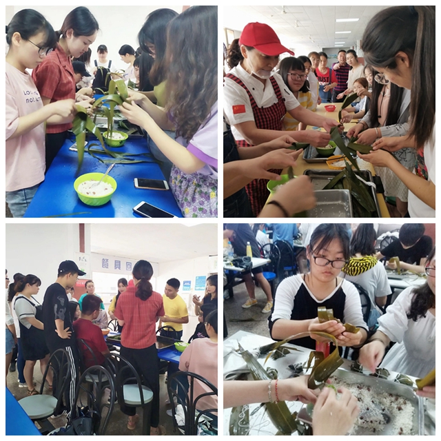 端午节前,各班级也纷纷开展包粽子活动,他们走进食堂,先是观摩食堂阿姨如何用糯米制作粽子馅儿。然后纷纷亲自动手,他们将荷叶对撕,铺上竹叶,放馅翻盖,接着将荷叶左右对摺,前后抓紧包成四角形,最后用碱草包紧打结,现场氛围热烈,其乐融融。