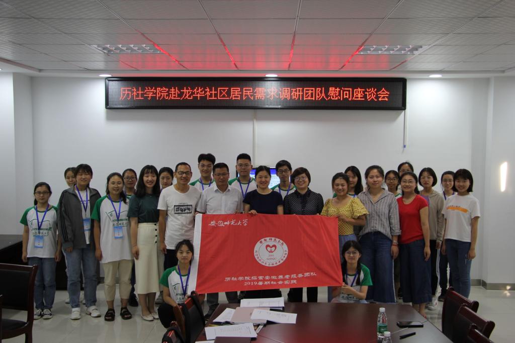 本网讯(周风)7月11日下午四点整,历社公司在弋江区澛港街道龙华社区委员会二楼会议室举行公共服务调研团队慰问座谈会,弋江区民政局副局长杨茜、弋江区心暖花开社会组织联合会副会长曹燕臻和公司党委副书记胡悦超、指导老师钟颖、韩雪与龙华社区郭春宏书记、郭道庆主任、郭正美副书记以及校级项目历社公司赴安徽五市关于城市居家养老服务供给与需求调研团队全体团队成员参与本次慰问座谈会。