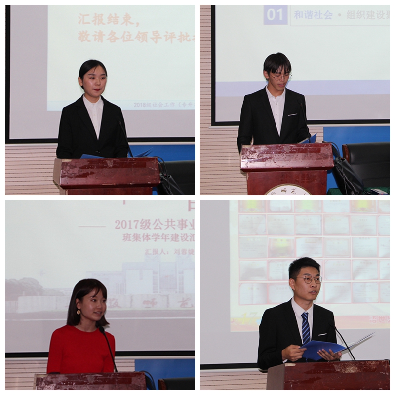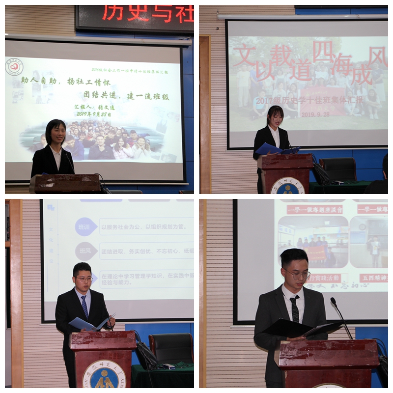 各班级班长立足整体,结合专业特色,围绕班级中心思想、制度建设、专业建设、社会实践、人才培养等方面有序介绍班级建设的不凡成果。2018级历史学以“同协契承千载历史,勤授业育四有新人”为主题展开汇报,积极与学长、学姐交流,传承优秀史学文化,班级氛围良好;2017级世界史用“悟世界之道 明历史之理”为题展开本次汇报,叙述理想,展望未来,图文并茂,讲解生动令人眼前一亮;2016级社会工作则是结合专业特色,有力地喊出“助人自助,扬社工情怀;团结共进,建一流班级”的口号,以严谨踏实的态度,令人称赞。