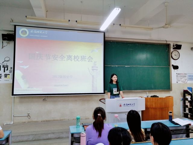 本网讯(17历史 闫洪菁)在迎接祖国母亲七十周年华诞之际,为增强同学们假期安全意识,确保同学们度过一个安全,愉快的国庆假期,2019年9月30日下午四点十分,17历史全体同学在2010302教室召开“国庆节安全离校班会”,本次班会由历社辅导员朱晓华老师主持。