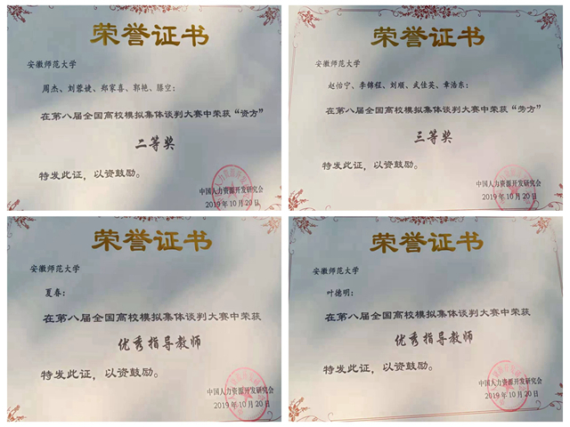 本网讯(2017级公共事业管理 赵怡宁)10月19日至20日,由中国人力资源开发研究会劳动关系分会、安徽财经大学主办的第八届全国高校模拟集体谈判大赛在安徽财经大学举行,公司公共事业管理专业派出师生参与此次大赛。经过连月的积极备战,以及现场初赛和决赛的激烈角逐,来自公司的两支代表队从全国的40所高校中脱颖而出,斩获多项荣誉。