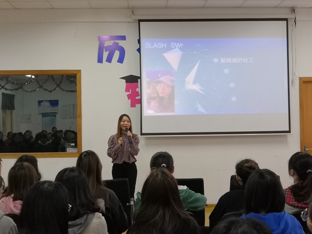 讲座二是由唐玉琳老师以《社工让我遇见更好的自己》为主题而进行的。唐老师首先以自我介绍和玩游戏的形式为大家引入了本次讲座的主题,活跃气氛,带动全场。接着唐老师用当下的社会政策向大家分析:何为社工以及社工的前景是什么,向同学们传递了最新的社工资讯,增加了同学们的见识。而后唐老师用“社工的不一样”“专业自信”“看到改变”“服务感受”“服务意义”“多元体系”“社工思维”“优势视角”“专业关系”“要求评估”等多个关键词依次向同学们说明自己对于社工的理解和亲身经历。唐老师用她的切身体会告诉同学们:“当你服务到一定程度,机遇将会和你不期而遇。”讲座最后的问答环节,同学们积极踊跃地提出问题,唐老师也很热情地依次为大家解答并展开讨论,气氛和谐欢快,同学们都受益匪浅。