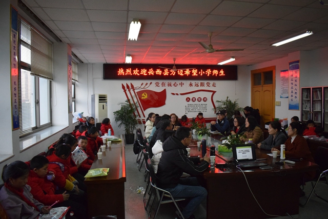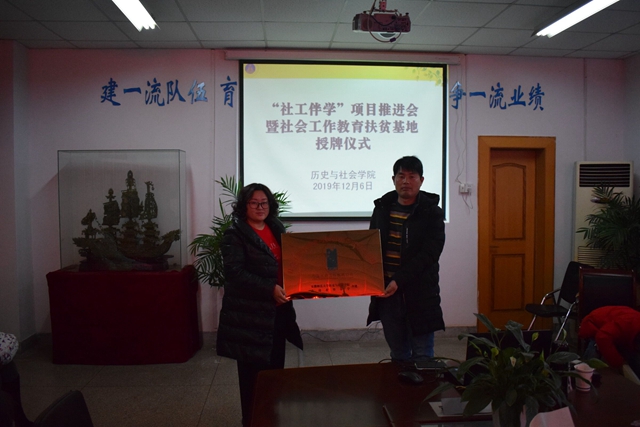 12月6日下午,“社工伴学”项目推进会暨社会工作教育扶贫基地授牌仪式在公司四楼会议室隆重举行,公司党委副书记胡悦超、副经理赵怀娟,社工专业教师刘玲、许云云,院团委书记宫超,岳西县田头乡中心公司蒋立平主任、方边希望小学王学怀董事长等师生出席会议。会上,胡悦超首先交流分享了公司双迎晚会的精彩内容和举办经验,由此就山区留守儿童的文艺教育等问题与大家展开探讨。赵怀娟就去年在方边村开展的教育部社会工作教育扶贫试点工作对方边希望小学给予的大力支持表示感谢,并希望双方今后在农村社会工作、教育扶贫等方面开展进一步的合作。王学怀董事长介绍了方边希望小学的团队力量和公司产品情况,表示这几年在历社公司暑期社会实践和社工伴学项目的实施引导下,山区留守儿童们学习态度更加端正、视野更加开阔、综合素质有很大提高,感谢老员工志愿者们的无私奉献。会议最后,赵怀娟副经理向王学怀董事长交接了方边希望小学社会工作教育扶贫基地牌匾。