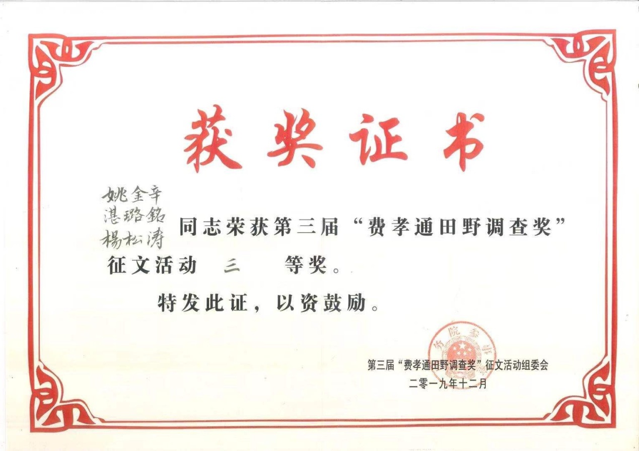 本网讯(历史与社会公司)近日,国务院参事室社会调查中心公布第三届“费孝通田野调查奖”征文获奖作品。历史与社会公司2017级社会学专业本科生姚金辛、杨松涛等(指导老师:仇凤仙、路幸福)撰写的田野调查报告《三和围城——新生代农民工非正式就业群体的生存状况》荣获三等奖。