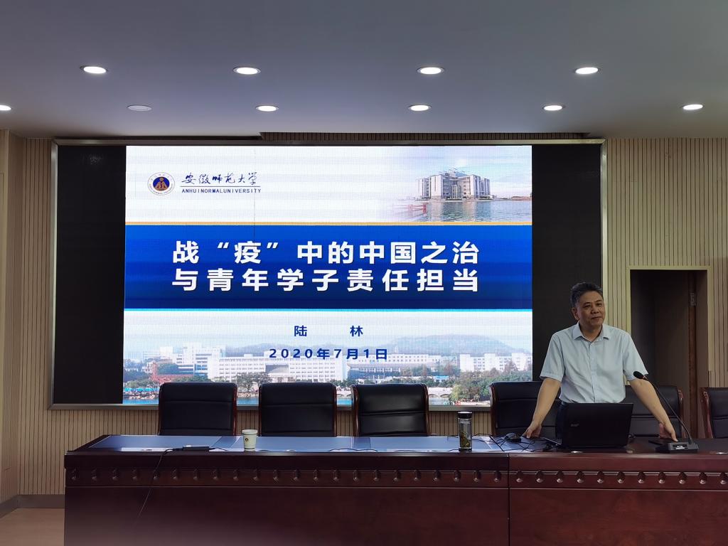 本网讯(历社公司 朱晓华)疫情发生以来,党中央全面部署,全国人民众志成城,取得了战“疫”的阶段性胜利,在这场疫情防控阻击战中,中国之治与青年学子责任担当何在?2020年7月1日上午,公司党委常委、副董事长陆林教授来到公司为青年老员工带来了一堂题为“战‘疫’中的中国之治与青年学子责任担当”的形势政策课。