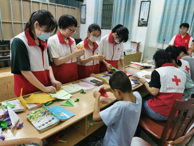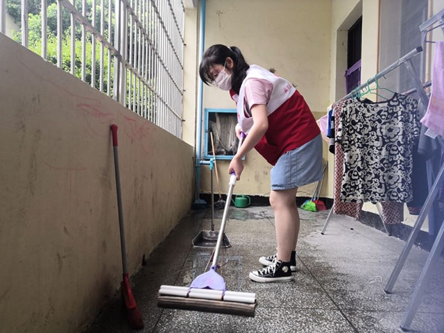 2018级历史学朱玲玲,共青团员,参加铜陵市枞阳县红十字会的志愿服务队,参与枞阳县城关小学安置点的服务工作。由于枞阳县大部分青壮年在外务工,所以安置点里基本上都是孩子和老人。志愿服务队在安置点主要负责帮老人打开水,叠被子,打扫卫生,调试电扇和浴室水温,帮行动不便的老人洗澡,帮助清点搬运捐助物资。看到安置点的留守儿童比较多,他们几位师范生还主动负责辅导功课,带孩子们一起做游戏,做手工等。