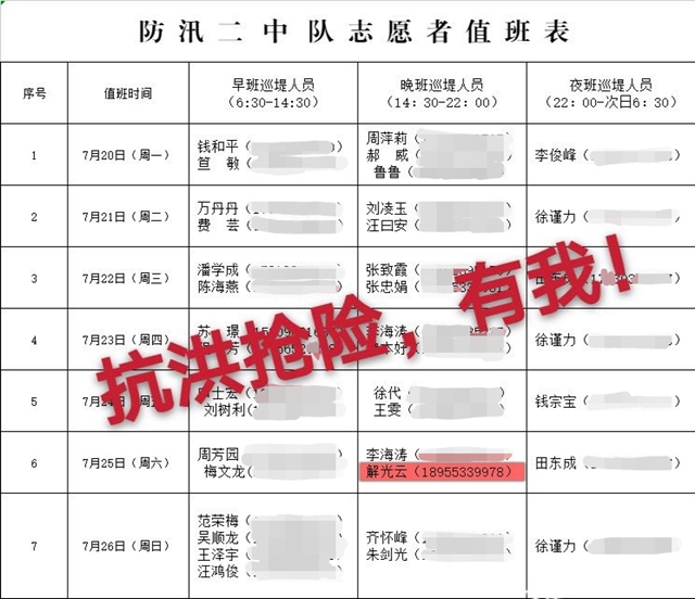 这是世界史专业解光云教授对于防汛工作的切身感受,道出了一个共产党人肩上的职责、心中的使命。解老师积极投身防汛抗洪志愿服务中,在澛港街道负责江段大堤值班巡查,师大也有很多老师和他一样加入了志愿者队伍。