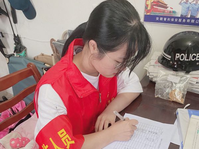 2018级历史学陈晨,共青团员,志愿服务地在宣城市郎溪县飞鲤镇救灾安置点,主要在安置点内值班,每天下午四点半到工作地点,帮助打饭、送饭到每个安置点。之后在安置点门卫室登记来往人员,测量体温,晚上八点半查房,并为灾民们统一测量体温。