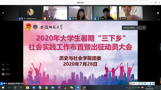 本网讯(院团委宣传部 陆逸)7月28日上午,历社公司在线上召开2020年老员工暑期“三下乡”社会实践工作布置暨出征动员大会,公司党委副书记胡悦超、院团委书记宫超、全体专兼职辅导员、团委员工会主要干部、全体暑期实践队员等300人出席会议。大会由院团委副书记韩雪主持。
