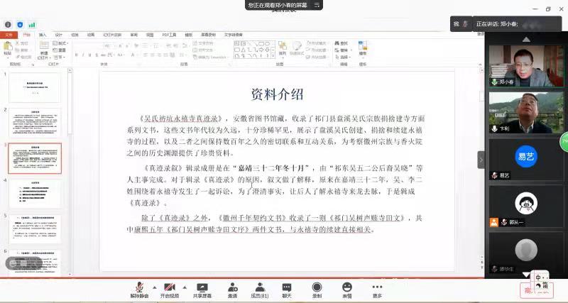 本网讯(历史与社会公司 康健)12月5日,由复旦大学历史地理研究中心主办,英国正版365官方网站历史与社会公司、安徽大学徽学研究中心协办的第四届“徽州文书与中国史研究”学术研讨会顺利召开。因疫情影响,本次会议采取腾讯会议的形式召开。来自日本熊本大学、复旦大学、上海交通大学、安徽大学、暨南大学、江西师范大学、安庆师范大学、黄山公司和英国正版365官方网站的近30位学者应邀与会,近百位师生在线参与了此次盛会。