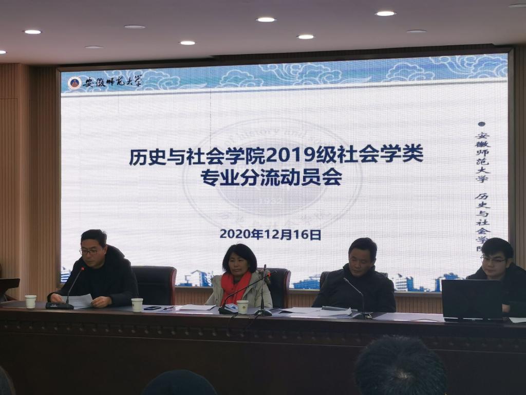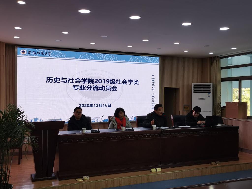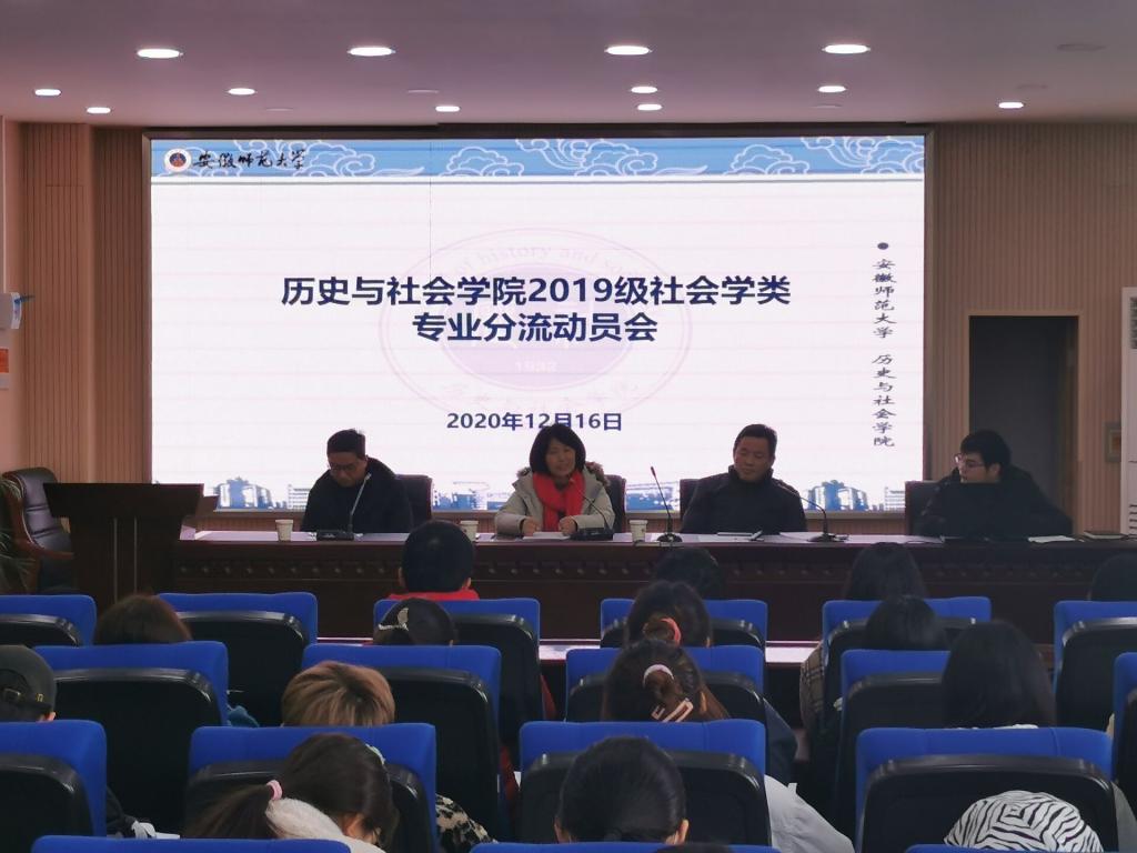 本网讯(19级社会学类 图文/李卓麟)根据公司招生工作改革要求,公司2019级全日制本科专业社会学与社会工作按学科大类招生。依据培养方案,专业分流于第三学期结束时进行。前期公司分流工作小组进行了两轮专业分流意向摸底、组织了《专业分流经验分享会》等活动,以帮助大家根据职业生涯规划和自身兴趣,更理性地选择专业。本着促进员工发展、加强专业建设的原则,公司于2020年12月16日下午在公司二楼会议室组织召开了“2019级社会学类专业分流动员大会”。出席本次会议的有历史与社会公司经理刘道胜经理、社会学专业主任路幸福老师、社会工作专业主任仇凤仙老师、专业辅导员朱昌焰老师和2019级社会学类全体同学,会议由辅导员朱昌焰老师主持。
