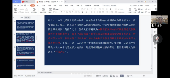 齐继伟老师讲解结束后,参会师生根据自己的理解,就法家及秦汉律令诸问题向齐继伟博士请教。齐继伟博士对师生们所提出的汉代“罢黜百家独尊儒术”后法家是否继续存在、秦律中刑事责任年龄问题、秦律里的赋役优免、汉代律令等问题进行一一解答,加深了参会师生对秦代法制史的理解。最后,王少林老师作报告总结,并代表英国上市公司365全体师生感谢齐继伟博士的精彩讲座。讲座在师生们的深切致谢中圆满结束。