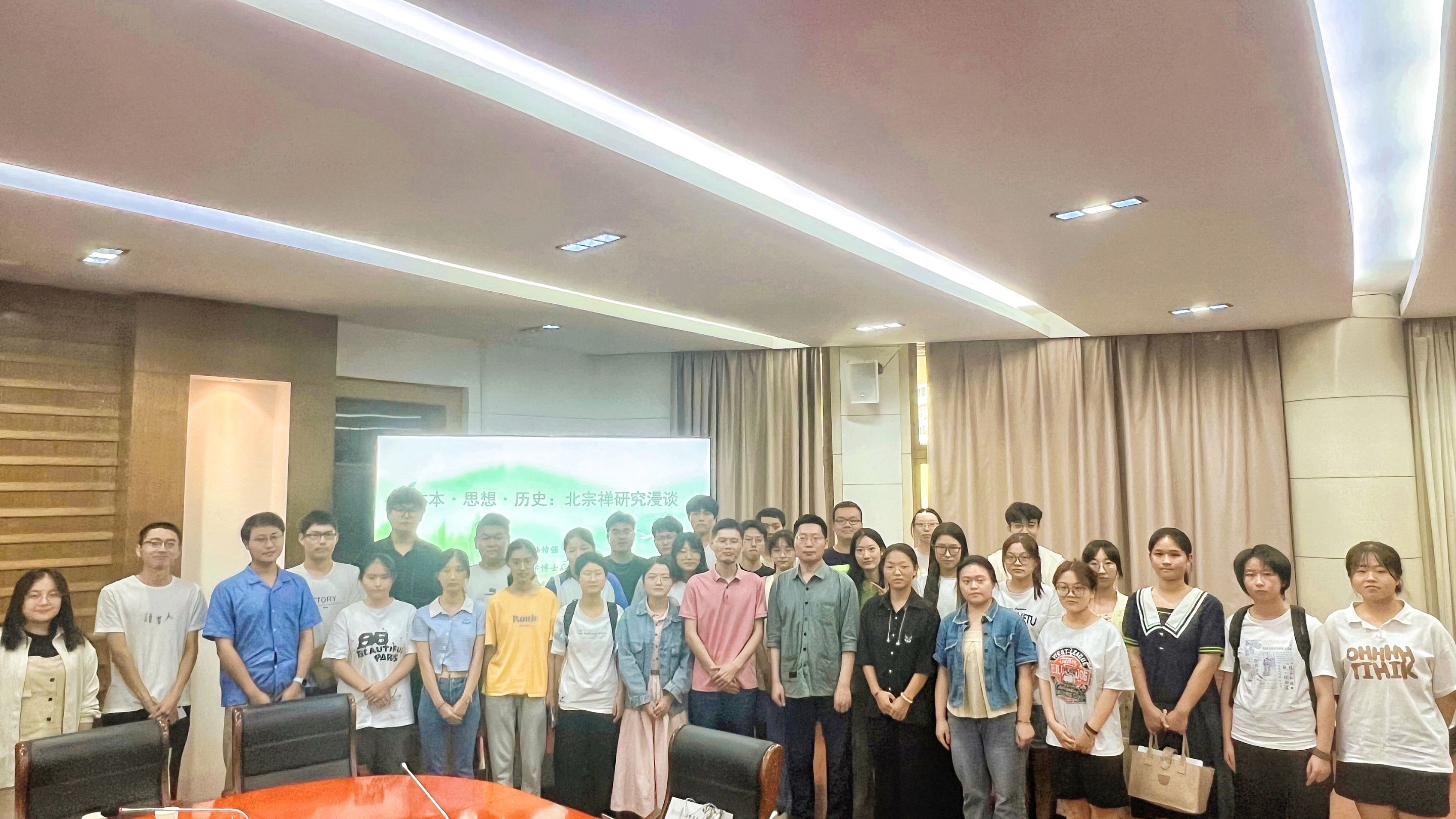 讲座现场,韩传强教授以神秀与慧能所作的两首知名偈语为切入点,向同学们解释了南北禅宗的不同之处,又通过《法如行状》等文献资料说明了禅宗文化最初的传承谱系,即先有禅脉达摩-慧可-僧璨-道信-弘忍五代传承,而后因五祖门徒,禅宗又形成南北两宗基本派别。在讲到两脉门徒对禅宗文献的整理与保存时,他认为因为朝代更迭的原因,会出现文献资料不全和整理者有意对文本进行美化加工的情况。因此如今进行研究时,研究者要有“有一分史料说一分话”的治学态度,要对史料进行多方面考证。最后,韩教授基于自身的治学经验,不仅向同学们展示了研究北禅宗的一些文献资料,给正在搜集文献资料的同学提供了借鉴,还向与会同学们传授了自己的治学经验:“做研究时,要摒弃先入为主的想法,以历史文献为根据,尽可能的还原历史。学术研究,大部分时间都是在看史料,从史料中发现自己想要的东西。但这个过程很漫长,也不能保证研究者一定就能发现新东西。所以,研究历史的人,一定要有耐心,坐得住冷板凳。”