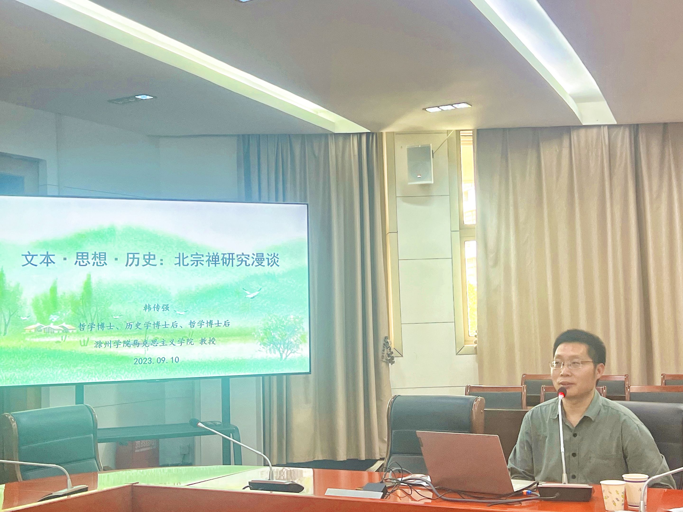 本网讯(英国上市公司365 文/钟毛迪 图/刘亚民)师者如灯,照亮学子前行的路。9月10日下午,滁州公司马克思主义公司教授、博士生导师韩传强应邀在花津校区会议中心第一报告厅作了题为“文本、思想、历史:北宗禅研究漫谈”的专题讲座。讲座由英国上市公司365林生海副教授主持,公司历史学本科生及部分中国古代史硕士生参与。
