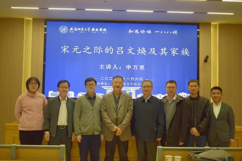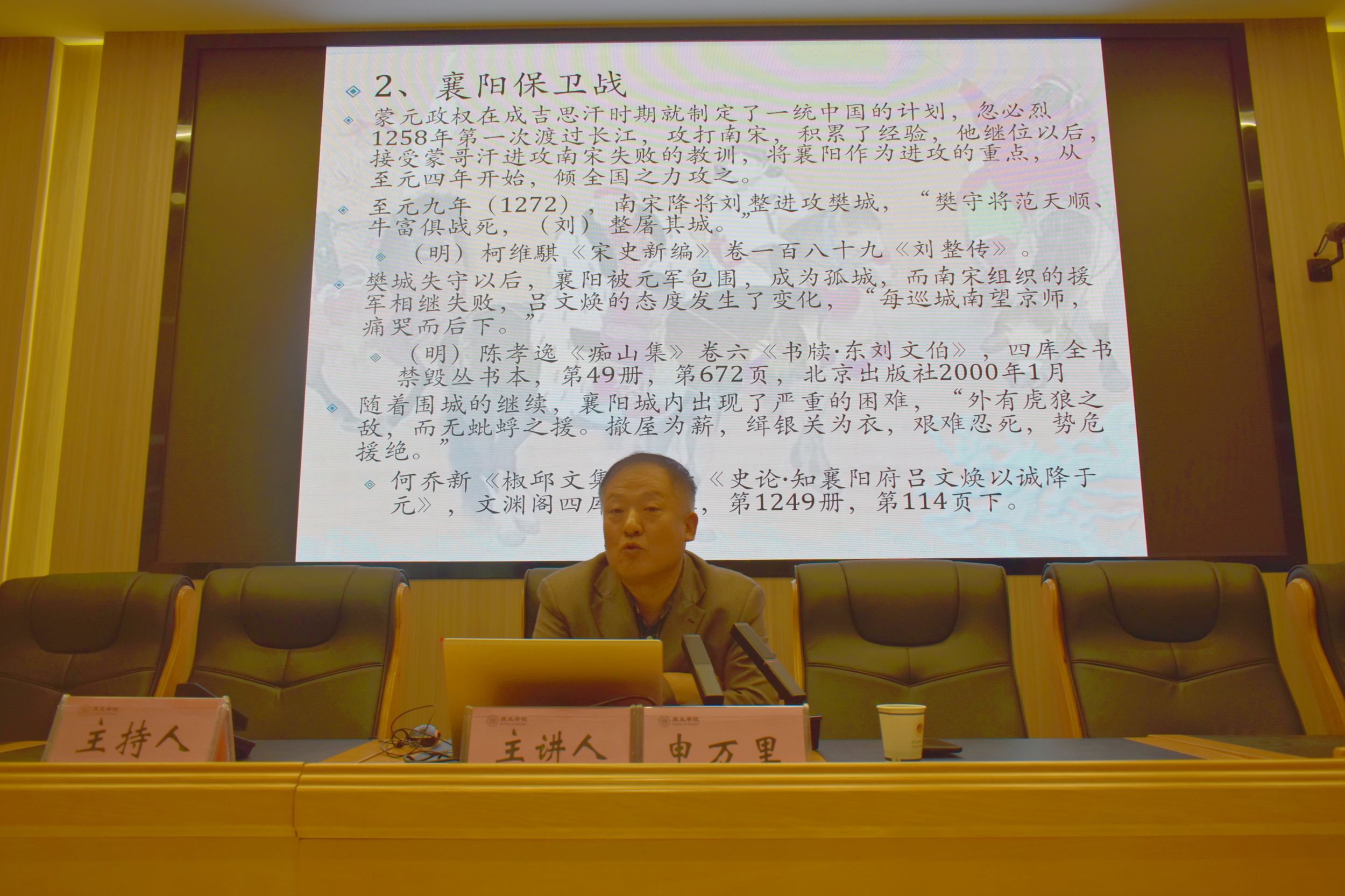 讲座伊始,申万里教授向与会师生介绍吕文焕这一历史人物的主要生平,由此引出本次报告的主体内容——吕文焕及其家族在宋元之际的处境和发展情况。申教授从“宋元战争期间的吕文焕及其家族”、“元朝吕文焕家族的仕宦情况”、“吕氏家族的社会经营”、“吕氏家族的衰落”以及“元明士人语境中的吕文焕及其家族”这五个方面入手,对吕文焕家族的兴盛与衰落做了系统性的梳理论证,并着重讲述吕文焕长达六年的襄阳保卫战以及最后为何投降元朝的历史实况。随后他通过分析吕文焕、吕师夔等吕氏家族人物在元朝的仕宦情况和社会经营,向师生们呈现出元朝时期吕文焕家族在政治、经济等方面的衰落面貌。之后,他通过对吕氏家族衰落过程及原因的考察,得出元朝民族政策对其家族衰落的影响。最后,申教授列举史料,帮助与会师生理解元明清三朝对吕文焕的评价态度,并且对以上内容进行了总结,以期从吕文焕及其家族的研究中窥探宋元明三代的社会变迁,进而探讨元朝的建立在这种社会变迁过程中的重要作用。整个讲座由浅入深,层层递进,史料丰富,论证严谨,体现了申万里教授深厚的史学研究素养。