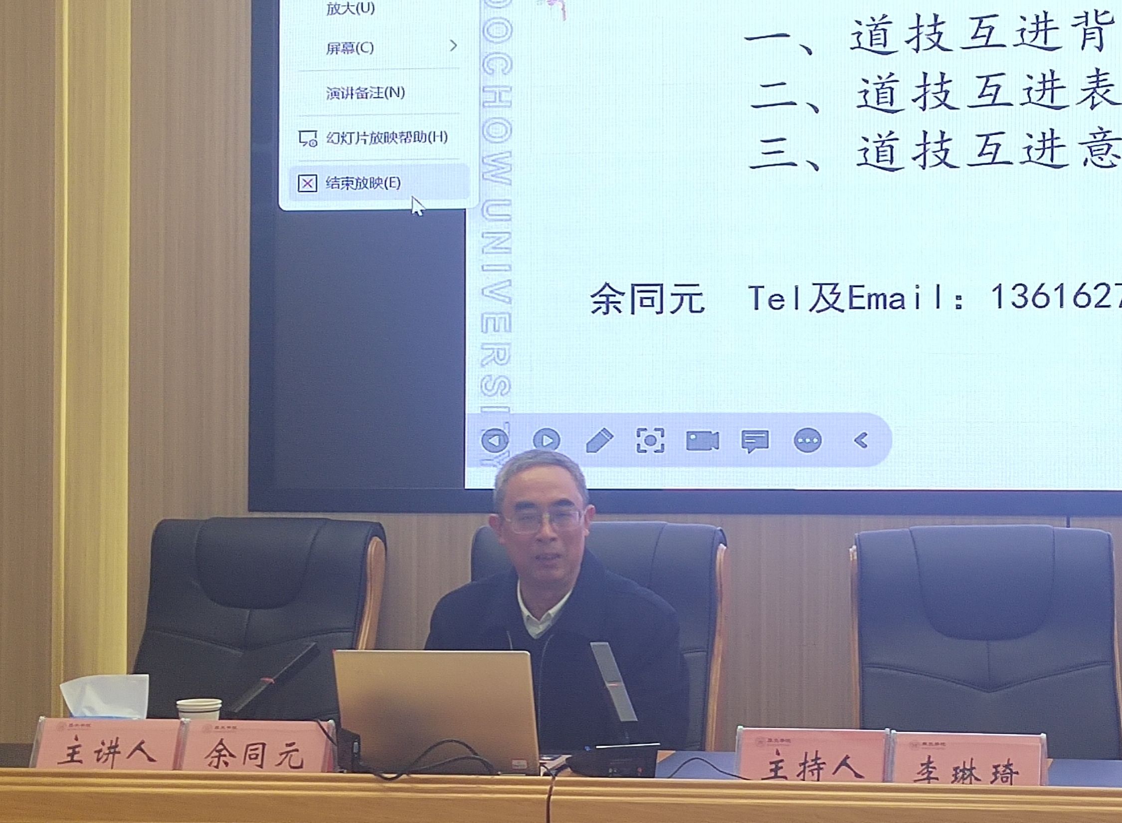 讲座现场,余同元教授首先介绍了道技互进的背景,并引用明代景泰年间华盖殿大学士徐有贞所言:“吾苏也,郡甲天下之郡,学甲天下之学,人才甲天下之才。伟哉!其有文献之足征也。”“三甲之说”是对苏州传统文化特点的高度概括,也进一步证明明清苏州是全国经济文化最为发达的城市。之后,余教授论述了吴中实学,不仅是经学实学,还有经济实学与科技史学,在学术互进与科技互动中,工匠与学者结合带来了技术理论化和科技互动创新。紧接着,余教授介绍了道技互进的表现,主要概括为产业技术理论化,具体表现为:一是传统产业技术文本化,并列举明清时期一些科技著作和展示嘉靖至乾隆江南八府产业文献分布图;二是苏作技术的数量化与数理化,余教授列举“苏州码”的使用以及数学歌诀在古建技术中的应用;三是苏州园林匠作技术则例化与标准化;四是苏州匠作技术教材化与学科化。在学者与工匠的结合中,学者自觉起到关键作用,也就是道进乎技。余教授在讲座最后指出了道技互进的意义:一是推动传统匠作技术创新,清代《匠作则例》从20世纪30年代开始发掘整理,数以百计。二是推动苏作技术经济兴起,从明中后期到清末民初,江南百工技艺产品中,“苏”字品牌日益引领时尚,与“吴”字品牌竞相流行,进京入宫,飘洋过海,辉煌数百年。三是保持田园生产与家居生活统一,技术发挥到最后就成为艺术,古代生活方式上的绿色化程度,今人均不可企及。