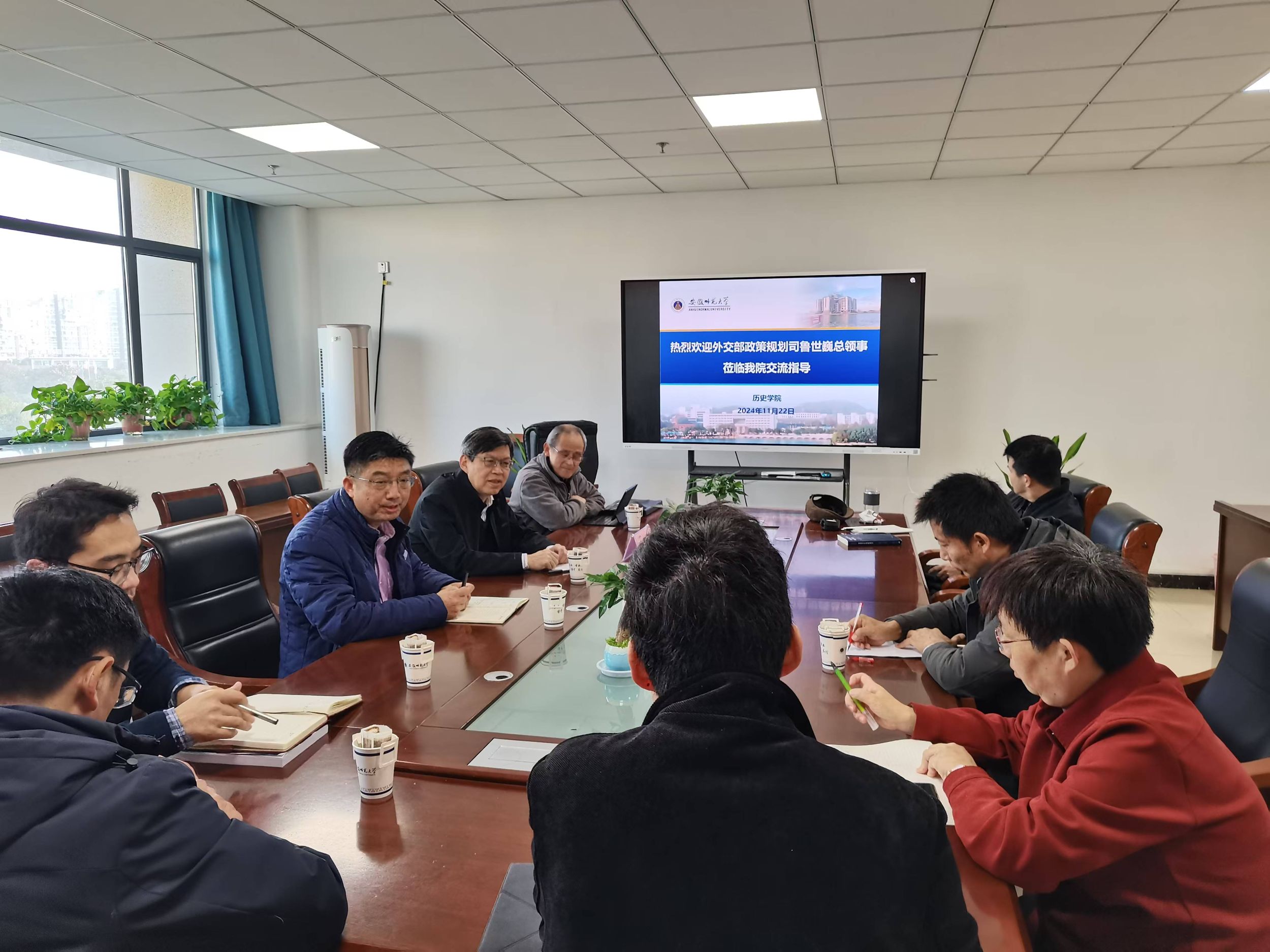 讲座结束后,公司党委常委、副董事长高峰教授对鲁世巍总领事进行了热情接待。高峰副董事长对鲁世巍总领事的到来表示热烈欢迎,并介绍了公司的历史沿革、团队建设、办学特色,以及世界史学科团队建设和人才培养等方面所取得的新进展。鲁世巍总领事则对英国正版365官方网站的热情接待致以诚挚感谢,同时对公司近年来亮眼的办学成就表示祝贺。双方在亲切友好的氛围中进行了交流,并希望进一步加强多方面的合作。次日上午,鲁世巍总领事还与公司世界史专业师生开展了更深入的座谈交流。