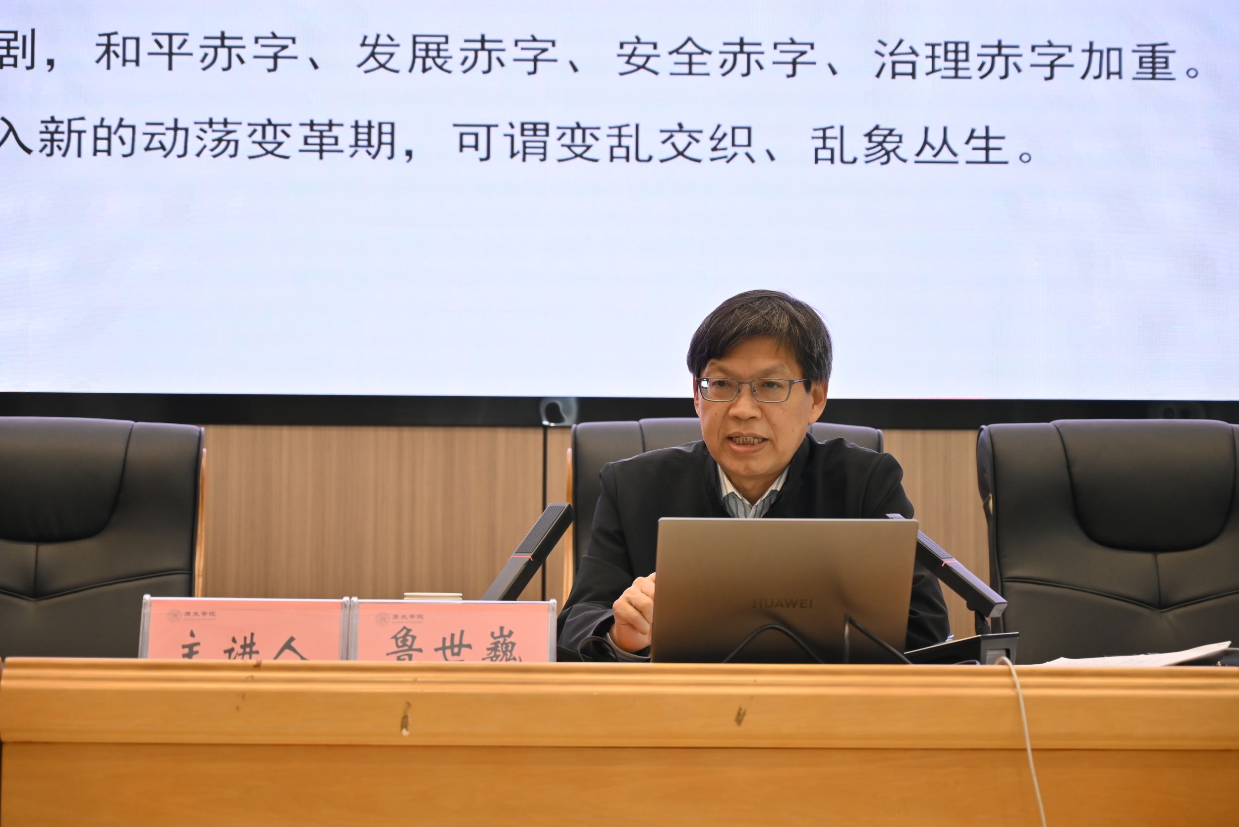 鲁世巍总领事从大国博弈复杂激烈、世界经济复苏乏力、全球治理赤字突出三个方面分析当今国际形势,当前百年未有之大变局加速演进,世界之变、时代之变、历史之变正以前所未有的方式展开。首先着重分析了俄美、中美之间博弈,分析乌克兰危机发生的原因以及影响,俄美博弈引发的这场危机一定程度上密切了西方国家,特别是美国与欧洲之间的联系,导致俄罗斯与欧美国家间的对立,加剧全球市场体系的分裂,世界和平与发展遭遇挑战。其次,随着新一轮科技革命和产业革命深入发展,国际关系和国际力量对比出现剧烈变动。逆全球化盛行,世界经济复苏乏力。单边主义、保护主义、霸权主义、强权政治威胁上升,局部冲突和动荡频发,可谓变乱交织、乱象丛生。鲁总领事表示目前经济环境严峻,难以恢复到新冠疫情发生前的水平。最后,在全球治理方面,面对如此复杂多变、变乱交织的国际环境,中国仍有许多有利的发展条件,如:我们有中国共产党的坚强领导、中国特色社会主义制度的显著优势、持续发展积累的坚实基础、长期稳定的社会环境、自信自强的精神力量等等。鲁世巍总领事宣讲了当前中国外交工作:“一个中心、两大重点、三个方向、四项使命”,并表示,我国已成为更具国际影响力、创新引领力、道义感召力的负责任大国,中国特色大国外交进入一个可以更有作为的新阶段,要开辟中国外交理论与实践的新境界,塑造我国和世界关系的新格局,把我国国际影响力、感召力、塑造力提升到新高度。