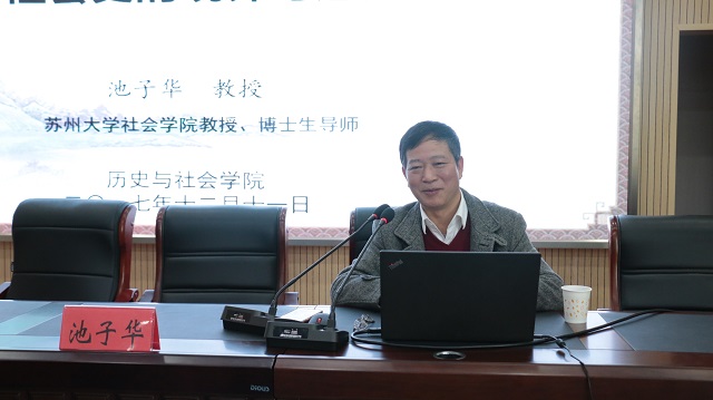 本网讯(历史与社会公司 黄郝萍)12月11日下午,公司员工、苏州大学社会公司博士生导师、红十字运动研究中心主任池子华教授应邀来公司作题为“社会史的境界与魅力”的讲座。讲座在公司行政楼二楼会议室举行,由公司副经理刘道胜教授主持,公司十余位教师和近百名研究生聆听了此次讲座。