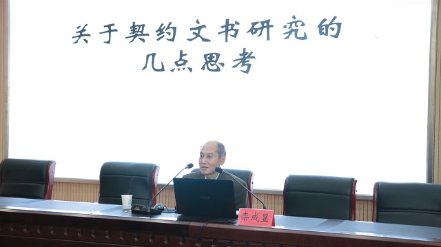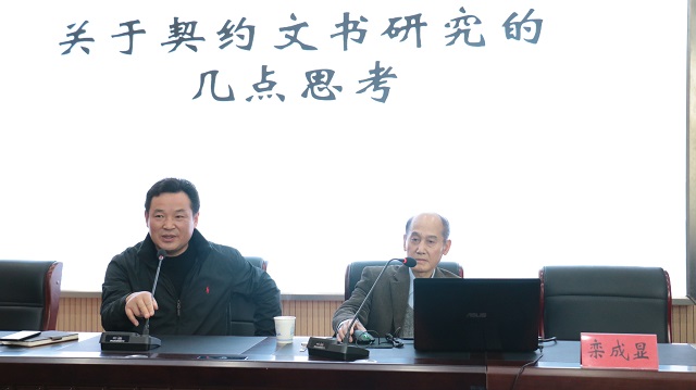 讲座伊始,刘道胜教授向我们介绍了栾成显研究员的治学成就,其中重点强调了栾先生治学严谨,“有一份材料说一分话”。随后,栾先生结合自身学习实践经历,从80年代关于契约文书研究者少、资料不全等困难的初始阶段谈起,向大家讲述了契约文书的兴起情况,重点指出在当代不仅研究契约文书的队伍扩大,相关资料也大批面世,并具体举例说明各地契约文书的面世情况。栾先生强调,时至今日,契约文书已经是史料构成的重要方面,契约文书研究成为中国古代史研究的重要领域,是当今史学研究的新潮流,而这些都是由契约文书本身的性质决定的。