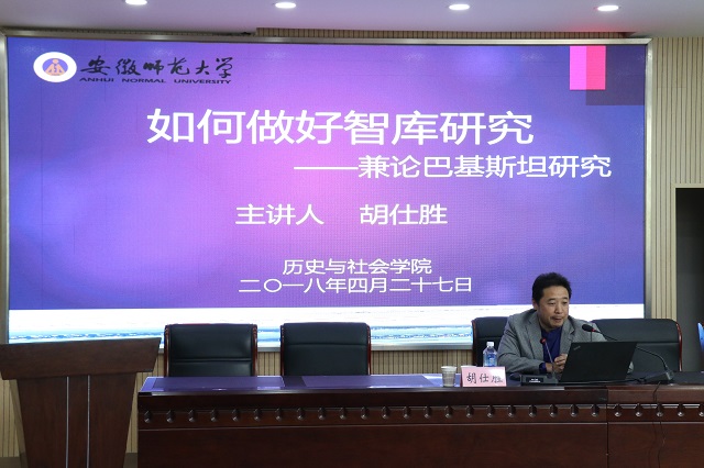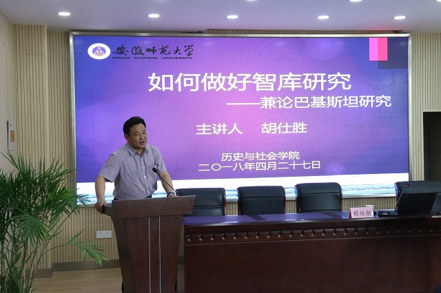 本网讯(历史与社会公司 叶枫)应历史与社会公司邀请,2018年4月27日上午,中国现代国际关系研究院南亚东南亚及大洋洲研究所所长、博士生导师胡仕胜研究员在公司二楼会议室,做客校庆90周年系列学术报告会暨文津论坛,做了题为“如何做好智库研究——兼论巴基斯坦研究”的专题讲座。科研处副处长谭书龙老师,公司解光云教授、韩家炳教授以及世界史专业的其他教师与研究生、部分本科生参加了本次学术活动。此次讲座由公司副经理刘道胜教授主持。