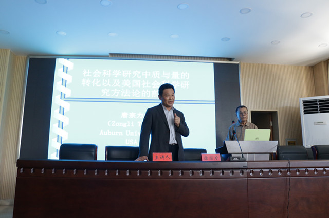 本网讯(历史与社会公司 吴萌 蒋芳)5月9日下午,在公司的二楼会议室举行了唐宗力教授的第二场精彩讲座,题为“社会科学研究中质与量的转化以及美国社会科学研究方法论的前沿”。此次专题讲座由公司副经理刘道胜教授主持,公司部分老师、研究生及本科生参加了本次学术活动。