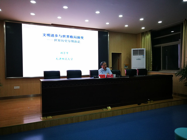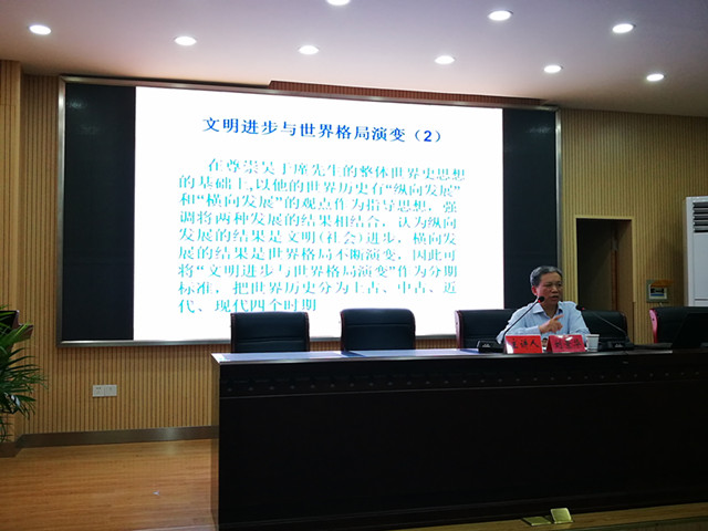 刘教授首先对不同时期不同学派不同人物对世界历史的分期进行了概括性的说明,并向我们详细介绍了国内外关于世界历史分期方面的8种分期方式。接着,刘教授在尊崇吴于廑先生的整体世界史思想的基础上,以“文明进步与世界格局不断演变”为标准,提出将世界历史分为上古、中古、近代、现代四个时期,并对不同时期文明的发展特征以及世界格局的变化发展做了详细的分析。他提出,从文明诞生到公元476年的上古世界是原发性文明的时代;从476年到16世纪则是农业文明和宗教文明共同作用的时代;16世纪一直到1945年的近代世界则是以西欧文明为主导并形成以西方为核心的世界体系的时代;而1945年以后的现代世界则呈现一种多极化的信息文明的时代。最后,刘教授还与公司师生进行了学术交流互动,并针对老师同学们所提出的国内外时事政治以及东西方文明冲突论等方面话题进行了独到的解答。