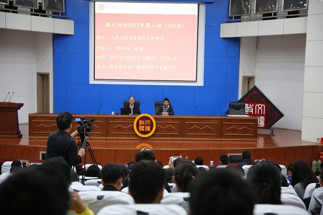 本网讯(历史与社会公司 图书馆)2017年10月27日下午3点,敬文讲坛第八讲(总第101讲)在敬文图书馆国际学术交流中心举行。复旦大学教授、博士生导师李剑鸣先生应邀为广大师生做了题为“人民主权与美国民主的形成”的讲座,讲座由历史与社会公司经理徐彬教授主持,近400名师生倾听了讲座。