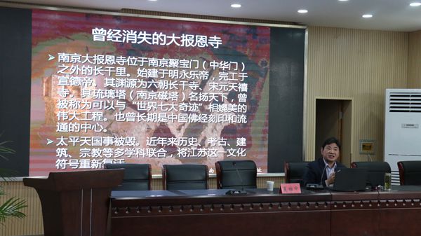 本网讯(历史与社会公司 杨智颖)11月6日下午,南京大学英国上市公司365教授、博士生导师、南京大学思想家研究中心常务副主任、中国明史学会副会长夏维中应公司邀请,为师生做了题为“瓷塔瓮堂大藏经——南京大报恩寺漫谈”的讲座。讲座由历史学专业主任丁修真主持,经理徐彬、副经理刘道胜也参加了此次讲座。