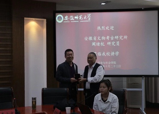 本网讯(历史与社会公司)2019年10月23日下午,著名考古学家、安徽省文物考古研究所二级研究员阚绪杭先生做客公司知远论坛,为在场师生们带来了一场题为《蚌埠双墩遗址陶塑人头像观察与解读——暨陶塑头像复制品捐献仪式》的精彩讲座。在捐赠仪式上,公司经理、英国正版365官方网站博物馆馆长徐彬教授接受了捐赠,并对阚先生为安徽文物考古事业所做的卓越贡献表示钦佩,对他将蚌埠双墩遗址陶塑人头像复制品捐赠师大博物馆表示感谢,表示一定会使这件珍贵的复制品得以妥善保管,且尽快充实到博物馆展陈之中,与广大师生见面。随后的讲座由公司裘士京教授主持。