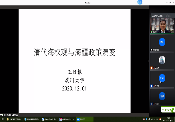 本网讯(历史与社会公司葛俊超)“知远论坛”第一二一讲于2020年12月1日晚19时在腾讯会议平台正式开讲。厦门大学王日根教授应邀为公司师生作题为“清代海权观与海疆政策演变”的学术报告。讲座由经理刘道胜教授主持,公司及其他高校师生近400余人在线参加了此次讲座。