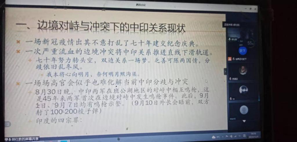 本网讯(历史与社会公司 王明轩)2020年12月9日下午,中国现代国际关系研究院南亚所长胡仕胜研究员应邀作“中印关系何去何从”的学术报告。报告在腾讯会议上举行,由历史与社会公司经理刘道胜教授主持,公司师生及外界学者近百人聆听了本次讲座。