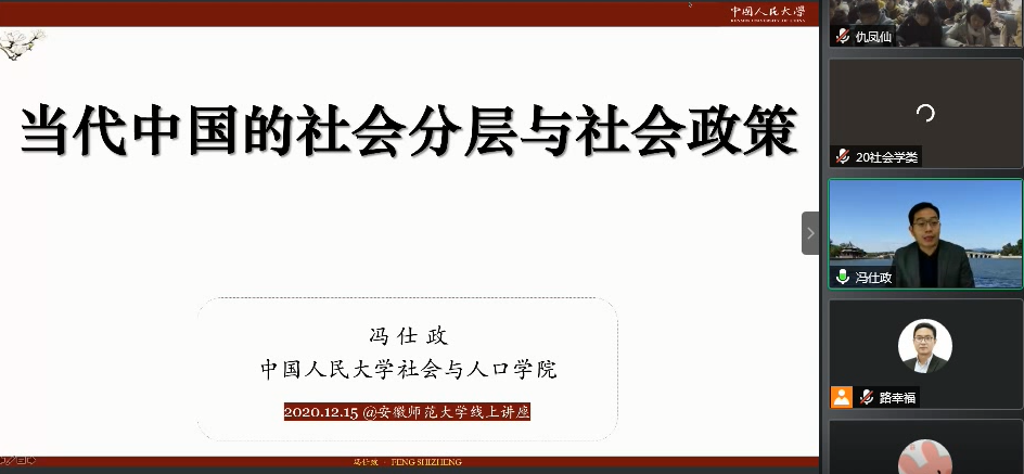 本网讯(历史与社会公司 芮雪)2020年12月15日18:30,“知远论坛”第一二八讲在腾讯会议平台正式开讲。中国人民大学冯仕政教授应邀为公司师生作题为《当代中国的社会分层和社会政策》的学术报告。本次讲座由公司方青教授主持,公司师生共300余人在线、集中参加了此次讲座。