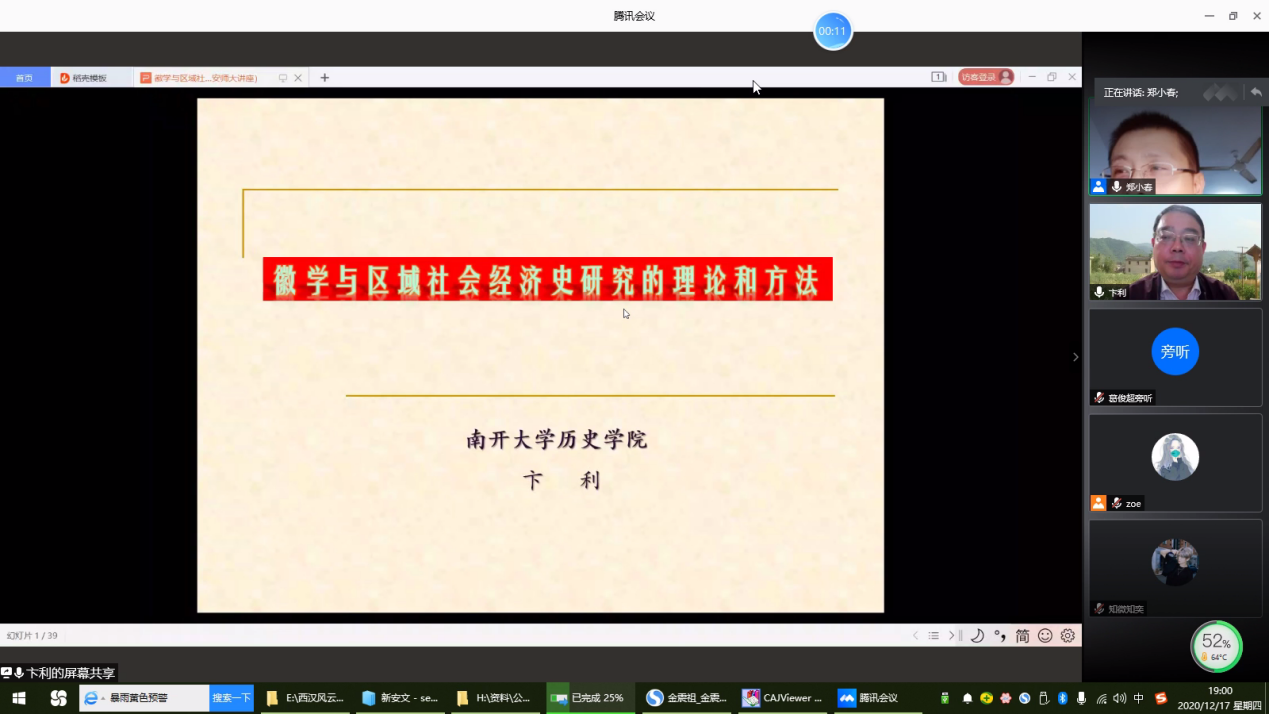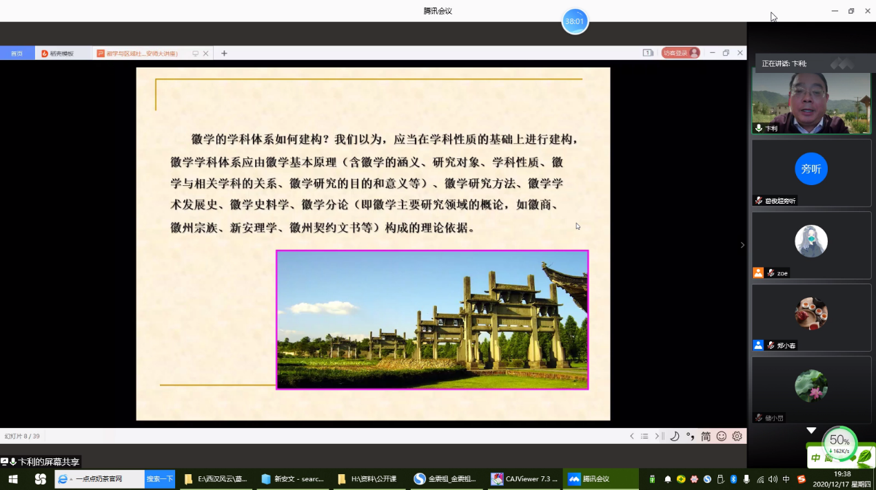 本网讯(历史与社会公司 葛俊超)2020年12月17日晚19时,“知远论坛”第一二九讲于腾讯会议平台开讲。本次论坛,公司邀请南开大学卞利教授作了题为“徽学与区域社会经济史研究的理论和方法”的精彩学术报告。郑小春教授主持报告,公司及其他高校师生共200余人以线上方式参加。