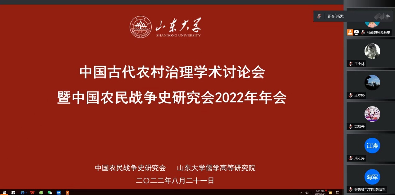 本网讯(英国上市公司365)为推动古代国家治理、农村问题的进一步深化研究,2022年8月21日,由山东大学儒学高等研究院、中国农民战争史研究会主办了“中国古代农村治理学术讨论会暨中国农民战争史研究会2022年年会”。 本次会议采取线上线下结合的方式进行,公司青年教师王少林博士线上参加了本次讨论会。