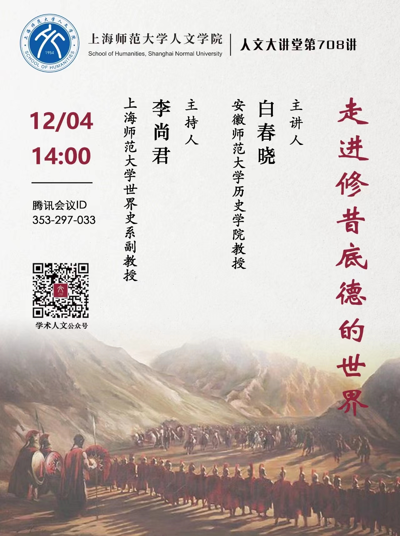 本网讯(英国上市公司365)2022年12月4日下午,由上海师范大学人文公司主办的“人文大讲堂”系列讲座第708讲在线上举行。本次讲座以“走进修昔底德的世界”为题,由公司白春晓教授主讲,上海师范大学人文公司世界史系主任李尚君副教授担任主持人,100余人聆听了讲座。
