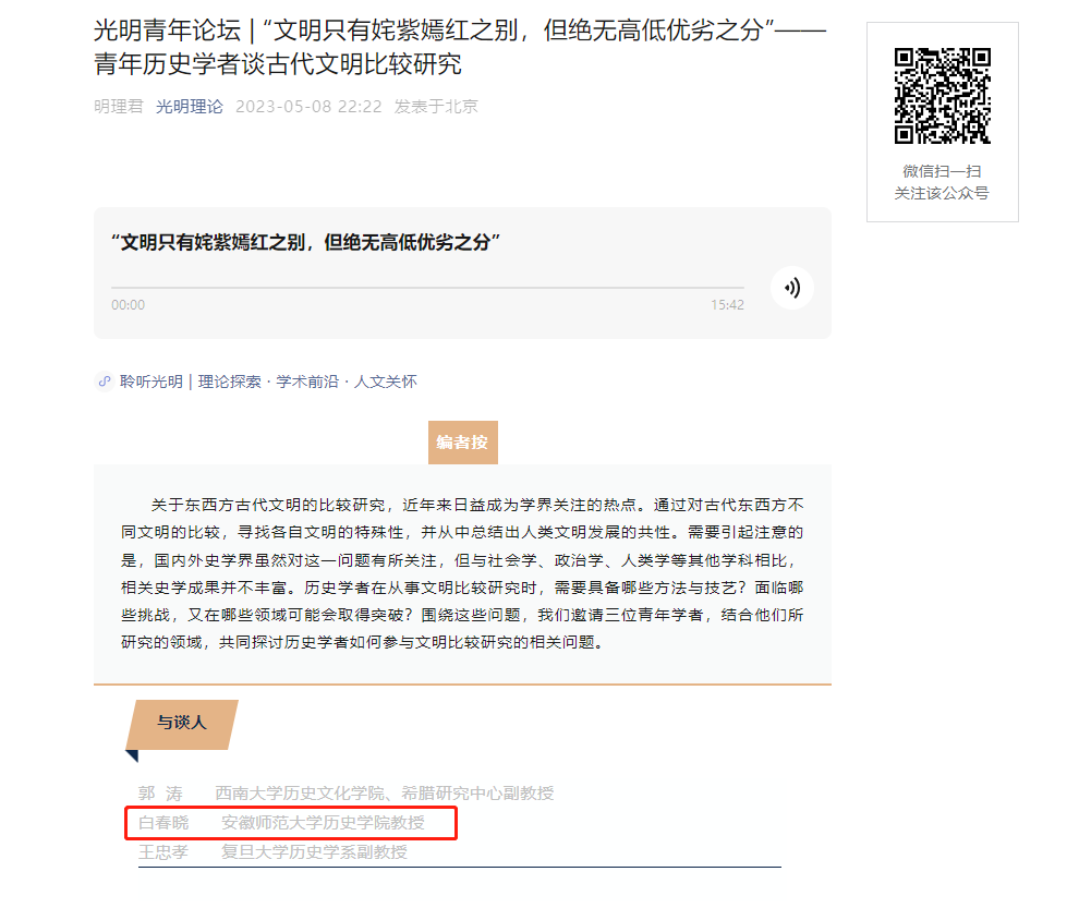 白春晓教授应邀参加“光明青年论坛”谈古代文明比较研究