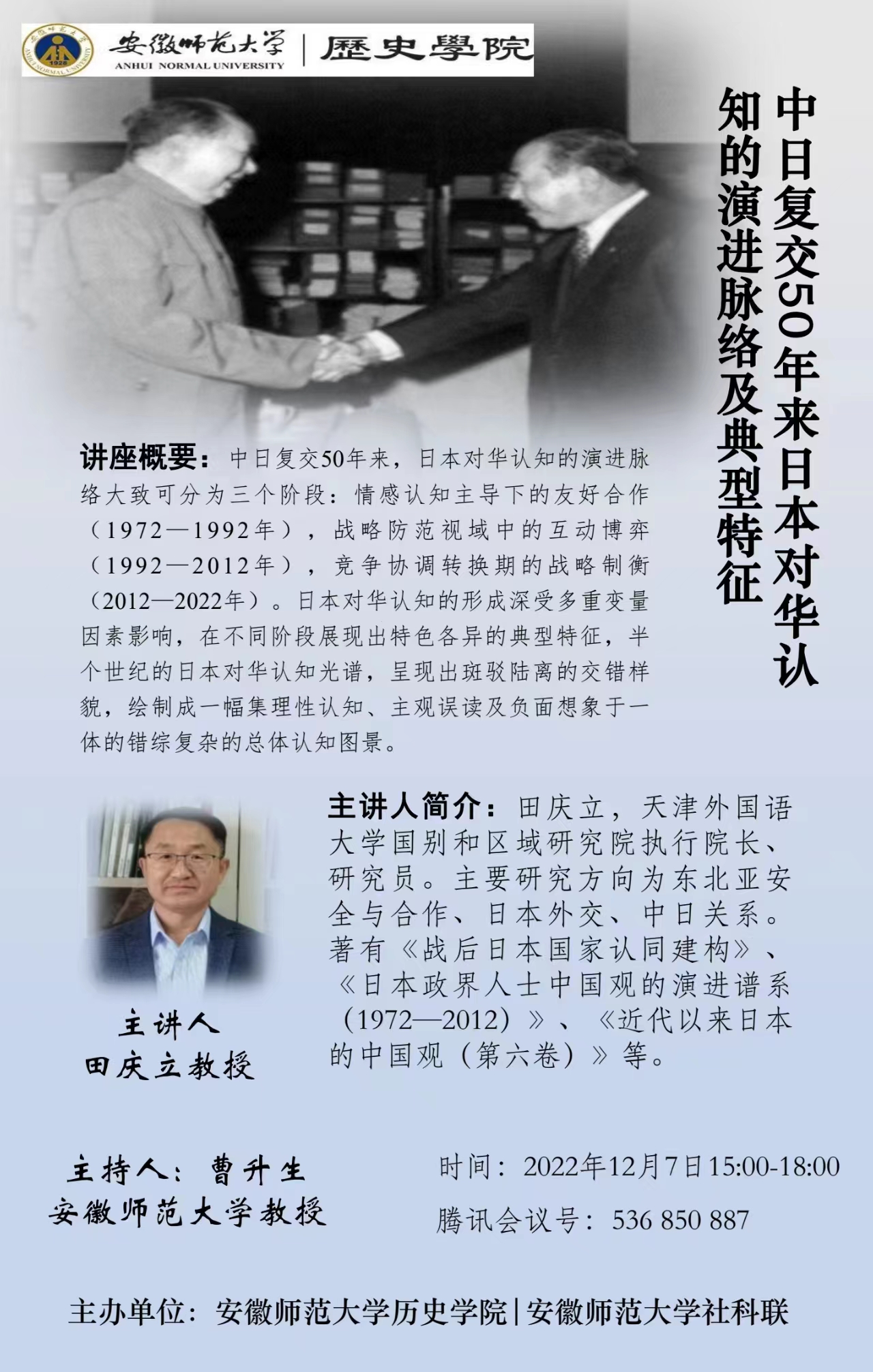【学术预告】中日复交50年来日本对华认知的演进脉络及典型特征(天津外国语大学 田庆立研究员)
