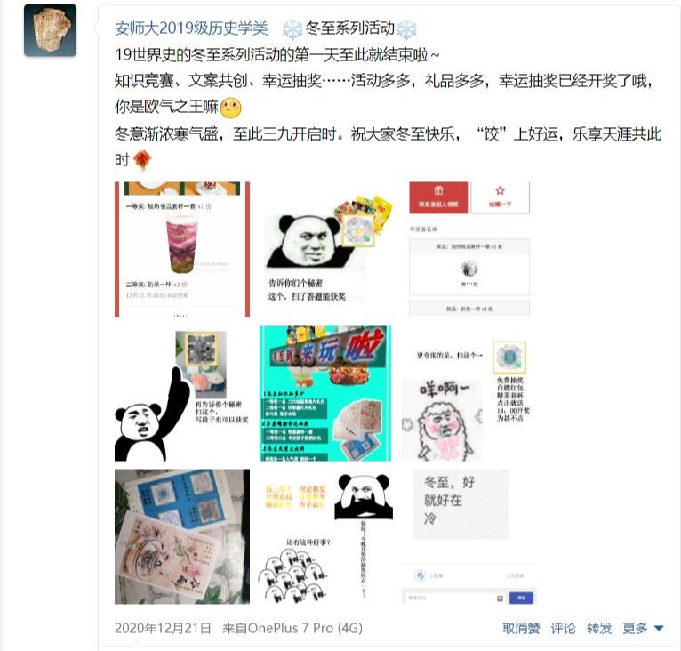 本网讯(19世界史何宇立 马志伟)冬至,又称日短至、冬节、亚岁等,兼具自然与人文两大内涵,既是二十四节气中一个重要的节气,也是中国民间的传统节日。本着团聚欢庆佳节,增进班级凝聚力的理念,12月21日发布活动,并于12月23日晚7点,19世界史齐聚2040103教室,同庆佳节。
