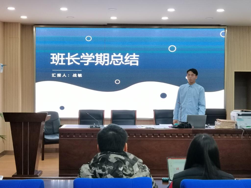 会议伊始,班长战毓同学第一个进行班长工作总结,他分别从两次班会、两次主题团日活动、班级活动、个人反思四个方面总结了本学期的工作,严谨详细,不仅总结了班长工作,也带领同学们回顾了班级开展的活动。