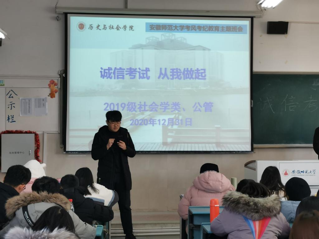 本网讯(图文/李卓麟)2020秋季学期期末考试周即将到来,为做好考前员工诚信教育,引导和培养良好考风考纪,维护正常考试秩序,19社会和19公管于12月31日中午开展了“诚信考试,从我做起”考风考纪教育主题班会。会议由辅导员朱昌焰老师主持,19社会和19公管全体同学参与。