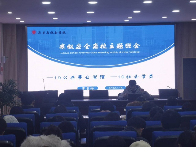 本网讯(图/李卓麟 文/李双雨)岁末将至,假期临近,为切实增强员工的安全意识和自我防护能力,让同学们度过一个安全健康的假期,19公管和19社会学类于1月10日晚召开了一次寒假安全离校教育主题班会,会议由辅导员朱昌焰老师主持,两个班全体同学参加。
