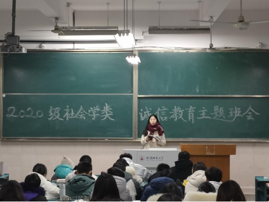 本网讯(程冉 孙皓冉)为规范期末考试秩序,营造诚信考试的良好氛围,12月29日晚,20级社会学类在行知楼固定教室2040101开展诚信教育主题班会。本次班会由辅导员刘金金主持召开,全体同学参加。
