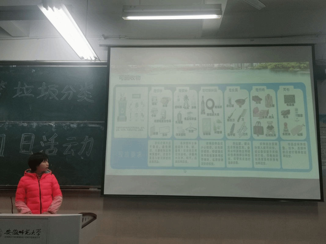 班会一开始,胡美银以PPT的方式向大家讲解了垃圾污染的危害、垃圾分类的细则和意义。根据芜湖市新规,垃圾共被分为四类,分别是可回收垃圾、厨余垃圾、有害垃圾和其他垃圾。为了解除大家在这四种分类方式上的疑惑,胡美银详细且全面地给同学们讲解了这四类垃圾的区分方式,并用生动有趣的语言——“猪能吃的是厨余垃圾”“猪吃了会死的是有害垃圾”,勾起了同学们对学习垃圾分类的兴趣。