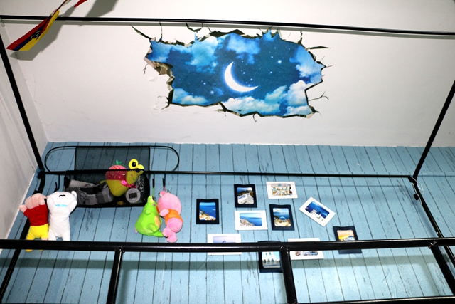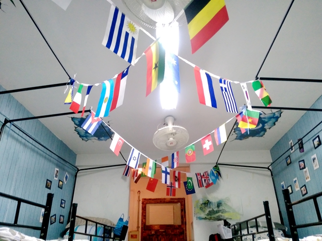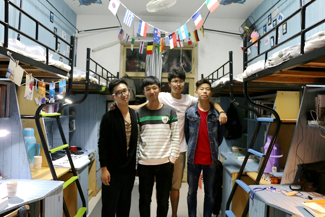 置身其中,入眼即是盥洗台前的一张窗外蔚蓝海天风景图,似有海风扑面而来;涉步而入,可见清新透亮的水蓝色木纹的书柜墙面,上缀稍许地中海风光的明信片。通体的冷色调,说不出的清新雅致,这样的环境,宜居更宜学习。极具亲和力的地中海风情,搭配上直逼自然的柔和色彩,自由奔放、多样明亮。除了整体设计风格的不拘一格、简约大气,着眼细节,也处处可见心思。海滩的地贴加之天花板的“穹顶星空”贴画,俯仰之间,是四个大男孩年轻有力的青春誓言:征途--星辰大海;墙壁上纸本设色的山水画与端庄遒劲的篆书可见其文墨情怀;床铺间拉着的50面各国国旗,则蕴含着他们对足球的热爱和环游世界的向往。