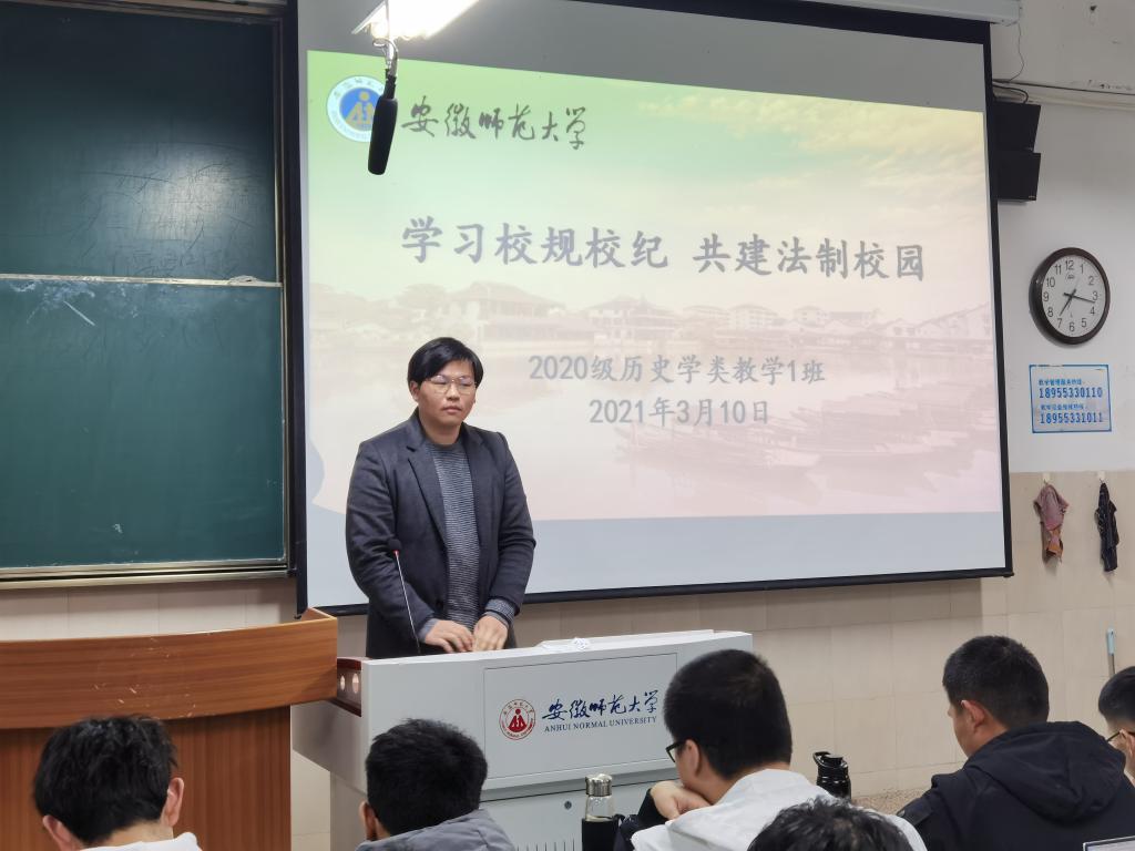 (本网讯 叶萌)为严格执行员工管理“四项禁令”和晚点名制度,引导员工把遵守法律法规、校规校纪内化为自觉行为,增强员工法制意识和规则意识,2020级历史学类四个班于3月10日晚在固定教室2050101、2050102开展了“学习校规校纪、共建法制校园”主题班会,重点学习《员工手册》相关管理规定。