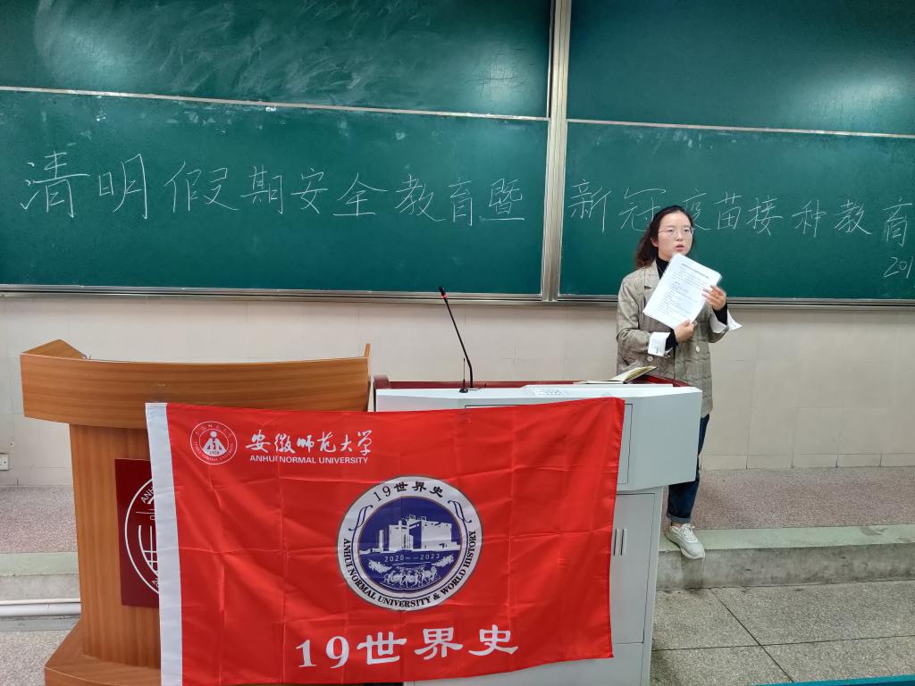 本网讯(19世界史 马志伟)3月30日下午,2019级历史学、世界史在教室分别召开了“清明假期安全教育暨新冠疫苗接种动员”主题班会。会议由辅导员周玲燕主持,各班全体同学参会。
