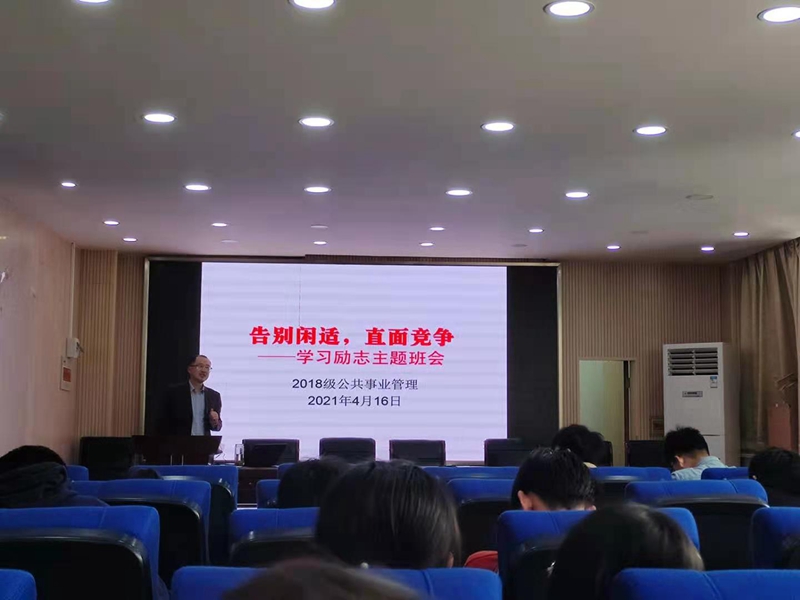 本网讯(18公管 熊依婕)为鼓舞同学们的学习斗志,指明前进方向,4月16日下午,2018级公管专业在公司二楼报告厅召开“告别闲适,直面竞争”主题班会,班会由辅导员宫超主讲。