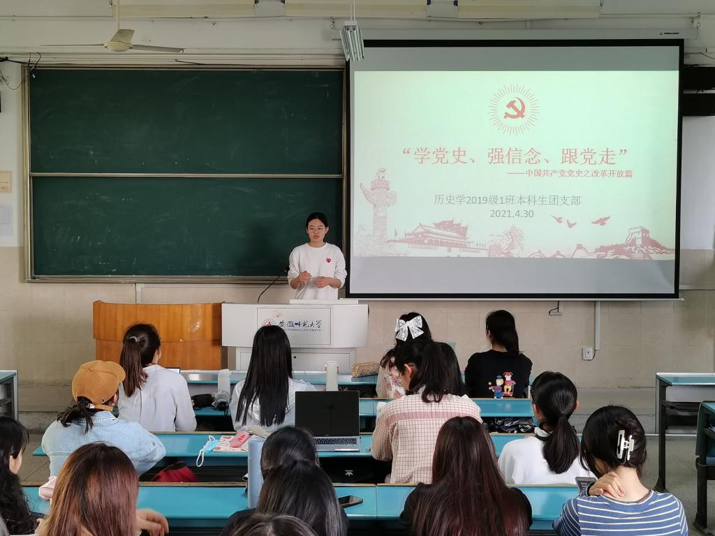 (本网讯 19历史师范1班刘燕杰 李良辉)为推动党史学习教育融入生活,促进同学们进一步了解改革开放历史,让大家认识到中华崛起道路的呕心沥血和锐意创新,4月30日下午,历史一班团支书梅立浩同学主持召开党史学习教育会,全体同学参加。